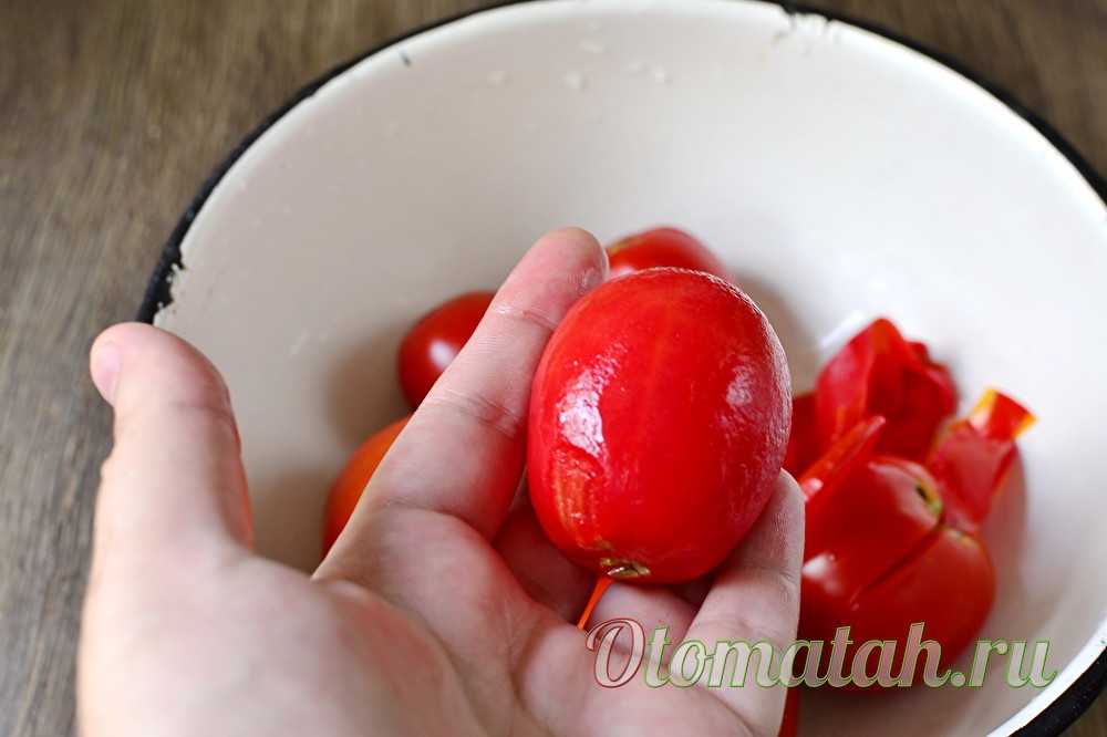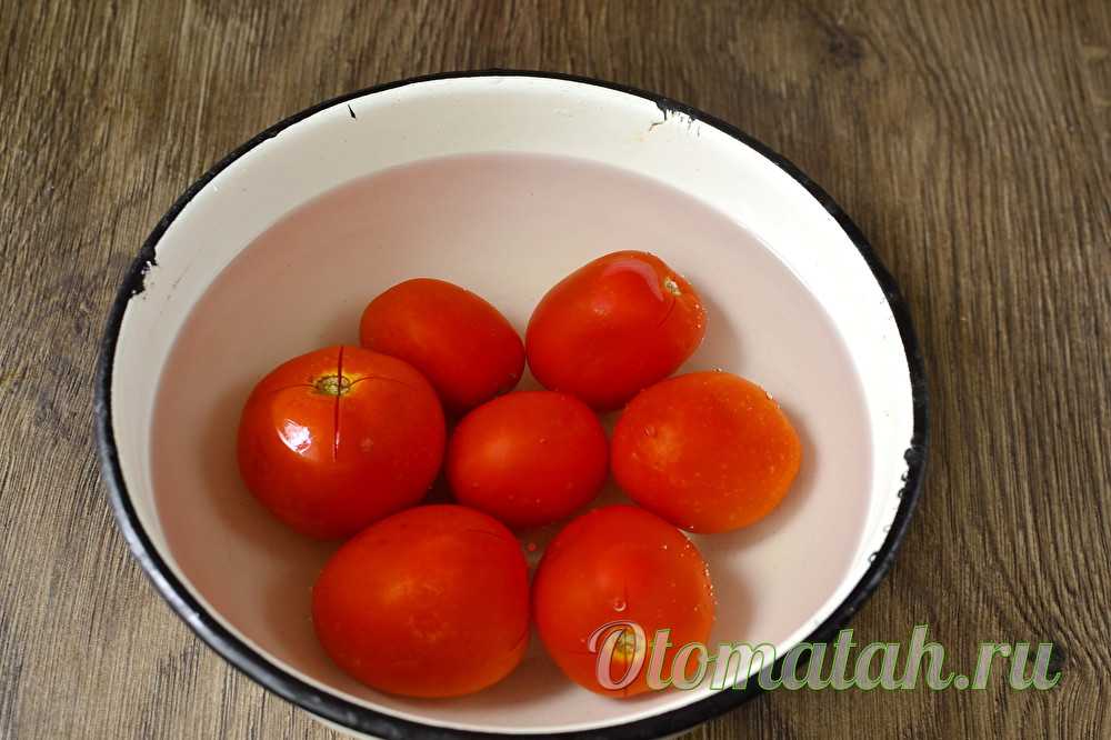 Берем спелые томаты, с мясистой структурой, промываем их и делаем небольшие проколы или надрезы. Кладем в миску, заливаем кипящей водой и прикрываем крышкой.
