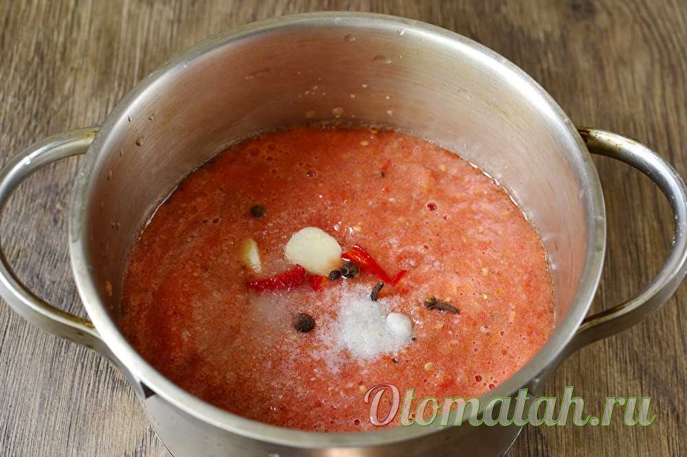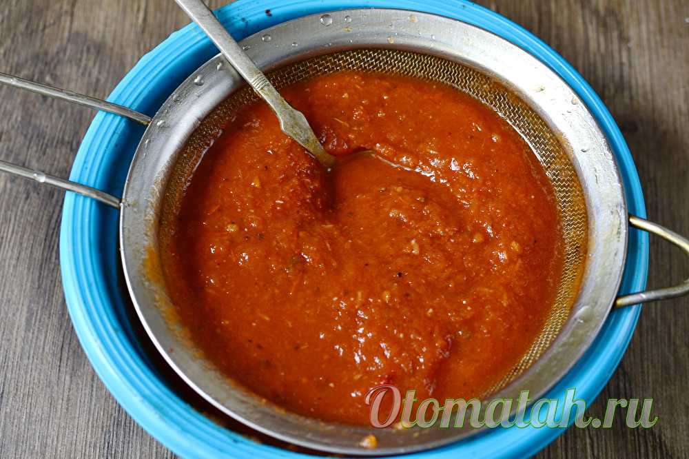 - даем томатной массе остыть и тщательно перетираем ее через мелкое сито;