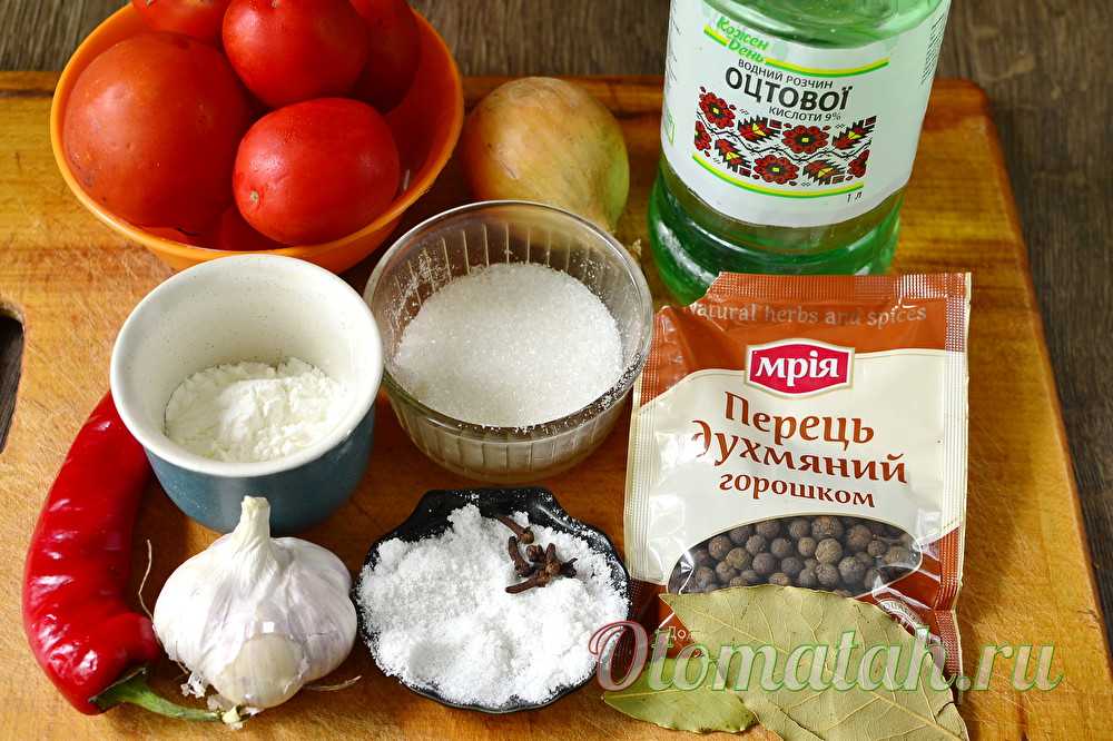 Тебе понадобится: 4 кг помидоров, 1 кг лука, 1 ч.л. молотого кориандра, 1 ч.л. молотого черного перца, 100 мл уксуса, 3 ст.л. крахмала, 120 г сахара, 2 ст.л. соли, 200 мл кипяченой воды.