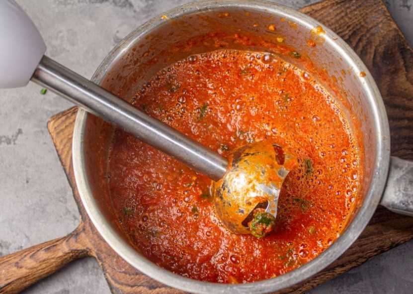 - Соус из томатов, приготовленный по этому рецепту, не будет отличаться по густоте от магазинного, а на его приготовление уйдет меньше времени чем при уваривании до нужной густоты.