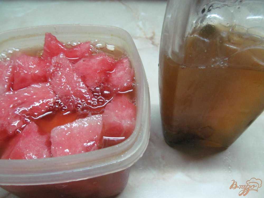 Холодным сиропом заливают контейнеры, наполненные кусочками вычищенного арбуза