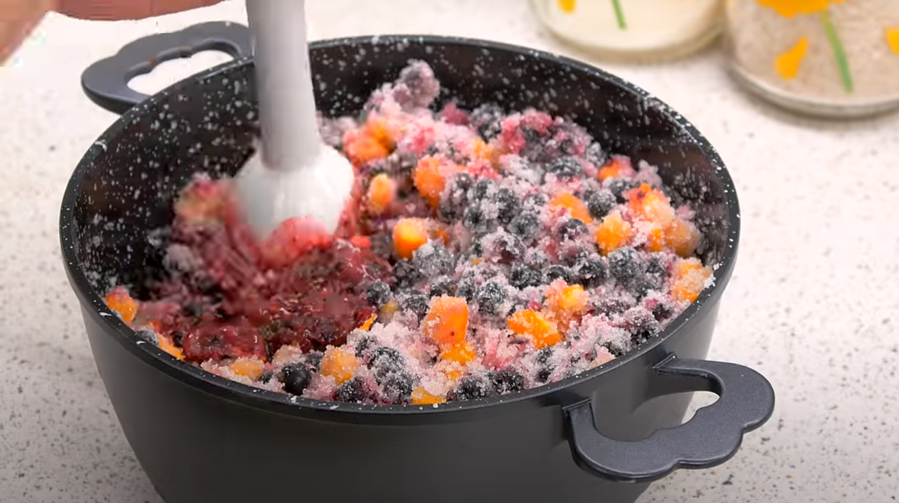 Берем погружной блендер и размалываем массу до однородности, но без фанатизма. Сразу весь сахар не растворится.
