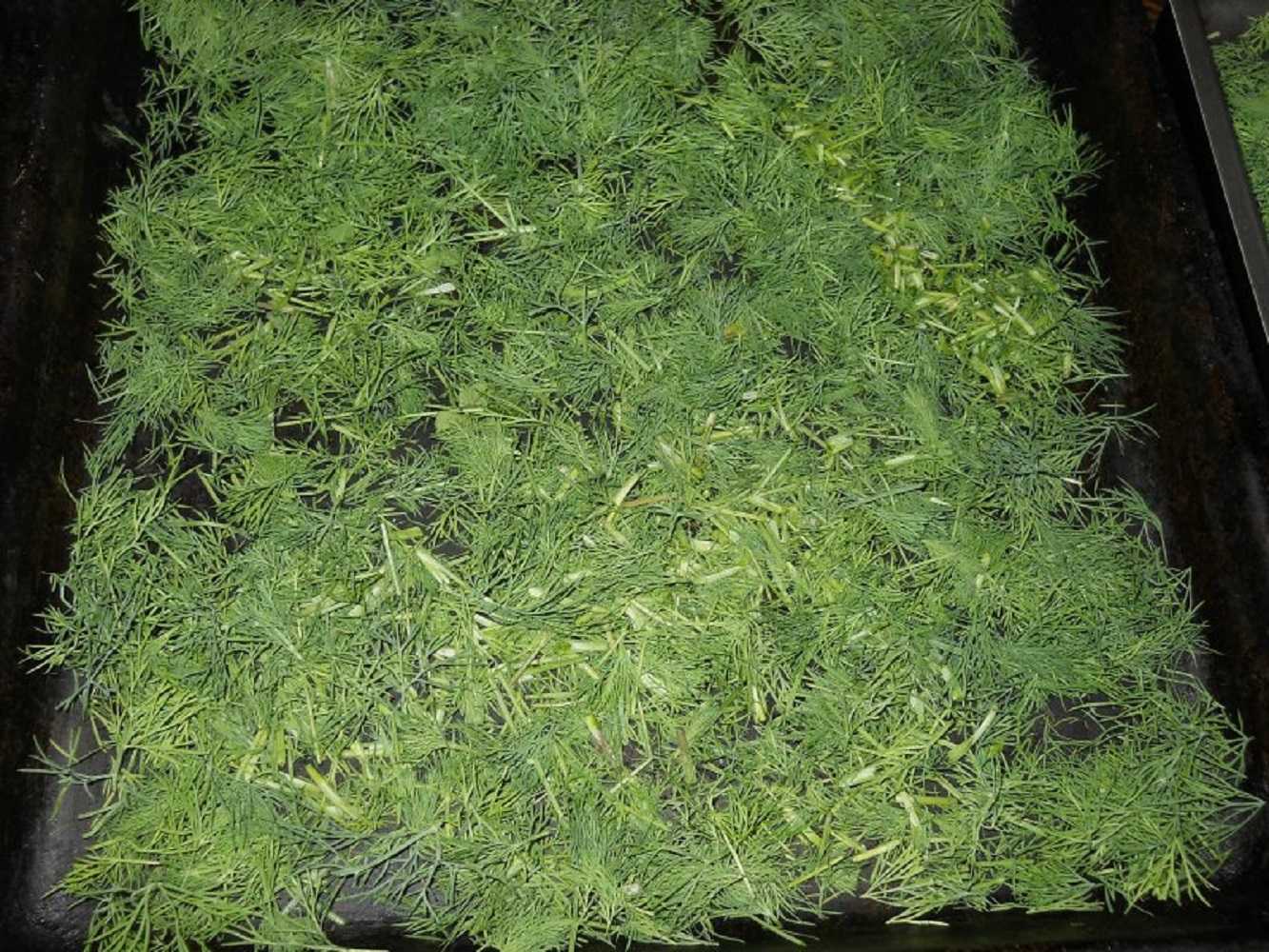 Чтобы засушить траву, все веточки раскладывают на противни и помещают в духовку на 20–25 минут. Затем зелень вынимают и проверяют степень ее просушки.