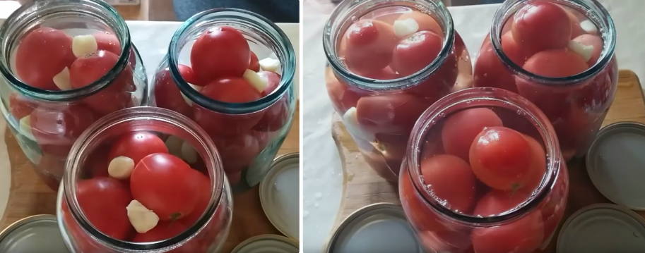 - Заполняйте банку помидорами, располагая между овощами зубчики чеснока.