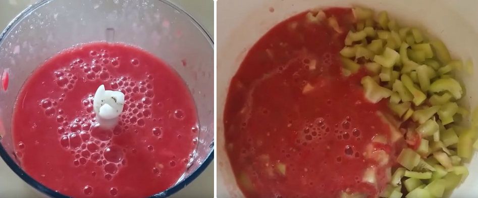 1. Желтый болгарский перец совместно с зубчиками чеснока прокрутите в чаше блендера до пюре.