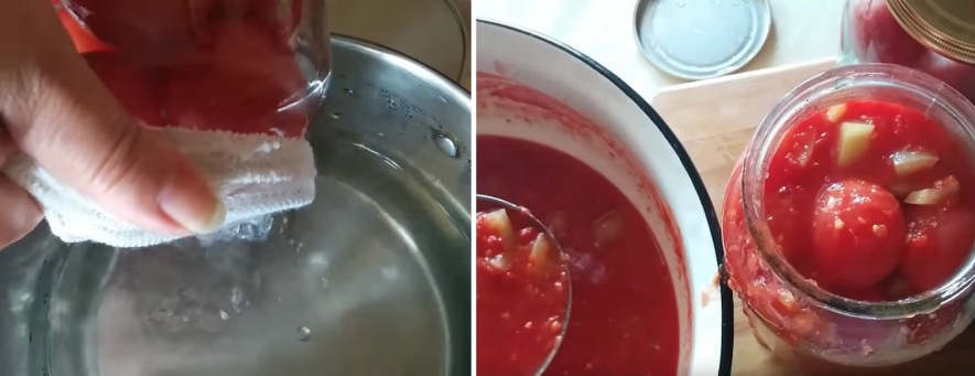 Это первый вариант, а второй — в стерилизованные баночки поместите массу из помидор слоями, переложите специальной заливкой из моркови. Накройте под капроновые или винтовые крышки. И поместите заготовки в кастрюлю. На дно положите полотенчико и налейте холодной воды по плечики. Доведите жидкость до кипения и оставьте на 15 минут стерилизоваться. Огонь сделайте маленький.