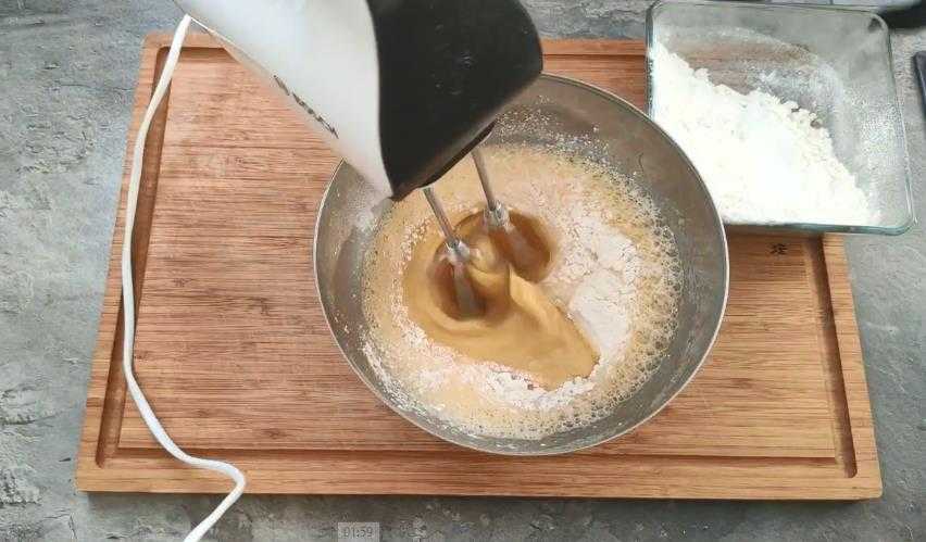 Добавьте муку и разрыхлитель. Тщательно перемешайте или также взбивайте до однородности. Для этого возьмите венчик, миксер или блендер на выбор.