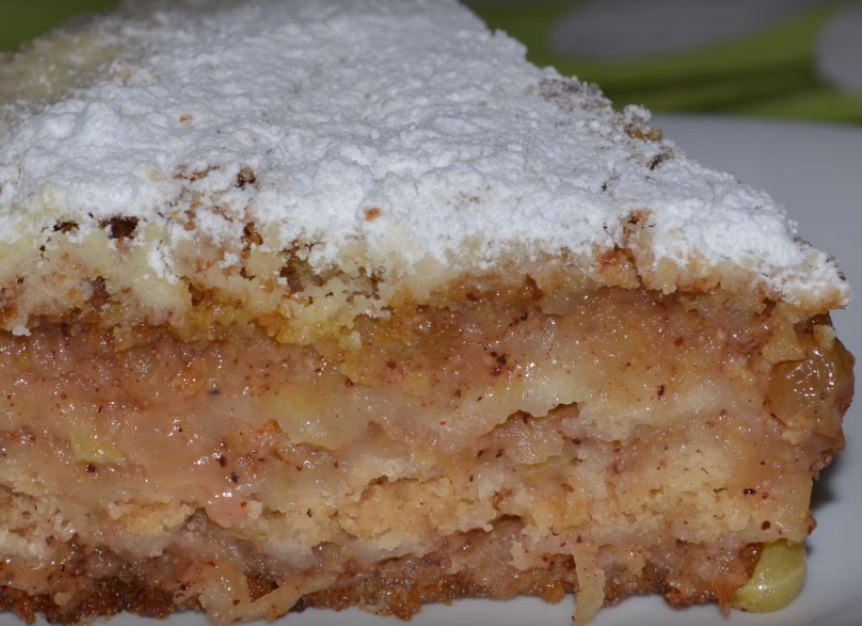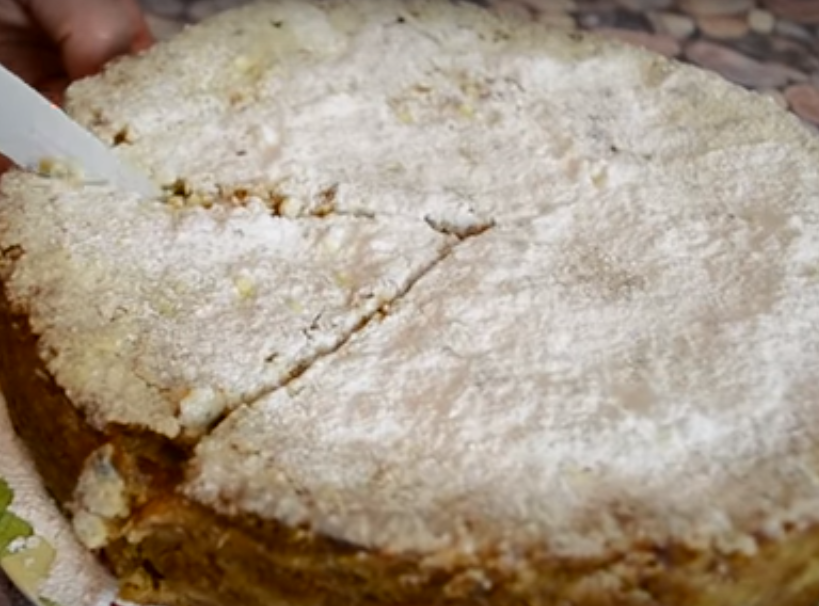 9) Отправляем в духовку, нагретую до 180 градусов на 25 минут, затем посыпаем сахаром о оставляем его допекаться 10 минут, достаем из духовки. Даем пирогу немного остыть и присыпаем его сахарной пудрой, пирог готов! Приятного аппетита!