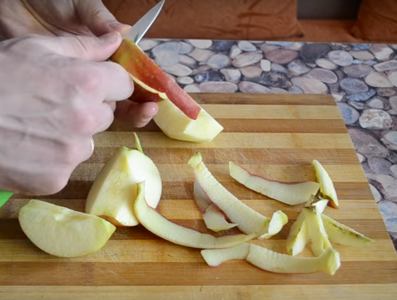 Яблоки разрезаем на восемь частей, семенные коробочки вырезаем, а вот кожицу лучше не срезать.