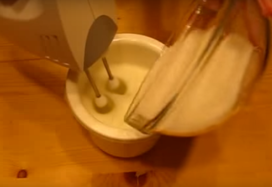 - В это время белок взбить с двумя ложками сахарной пудры до получения плотной массы.