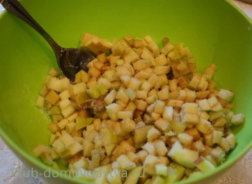Очищенные яблоки нарежем небольшими кубиками или ломтиками, как вам больше нравится. Чтобы яблочки не потемнели за время приготовления теста, можно сбрызнуть их соком лимона.