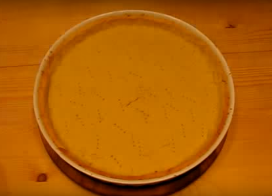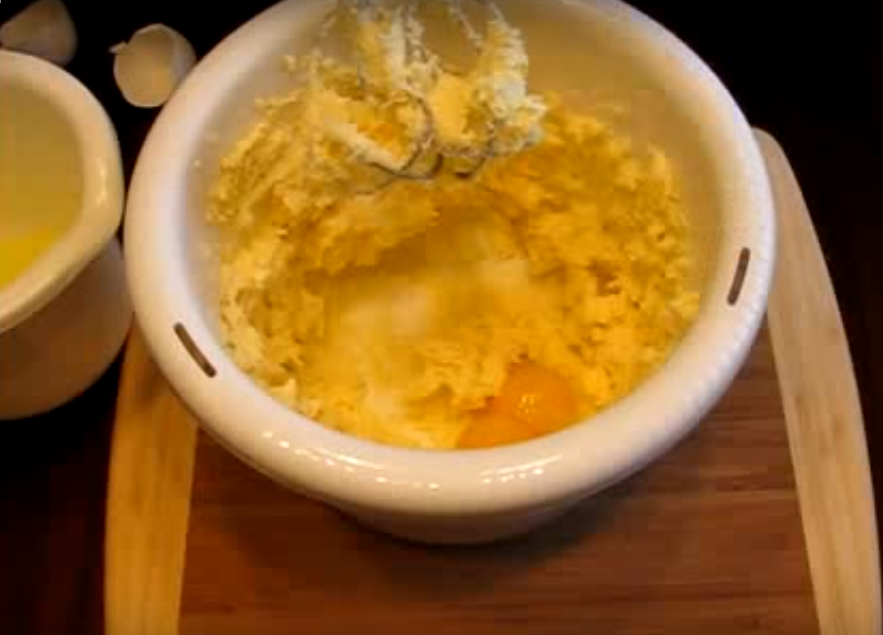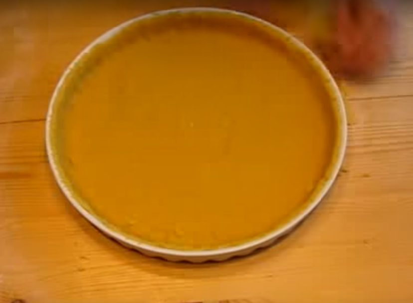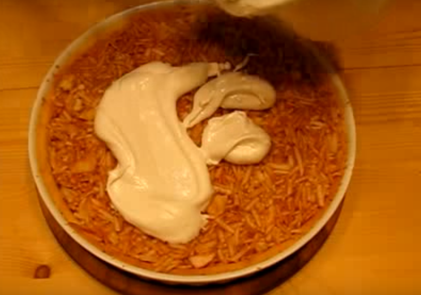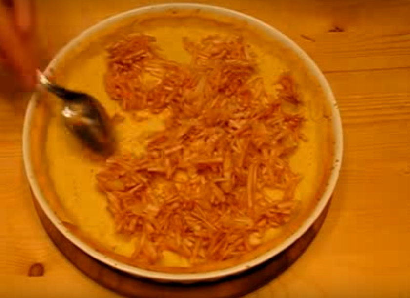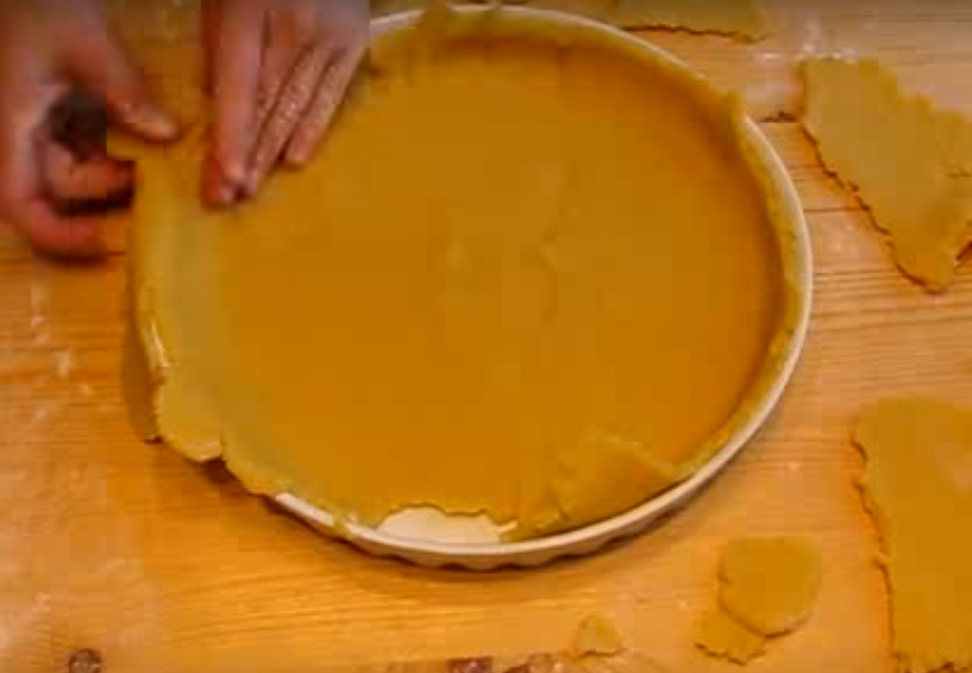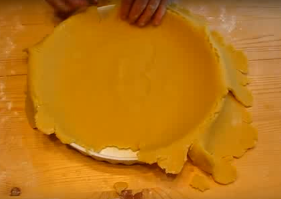 - К массе добавить яичный желток, руками превратить ее в крошащееся тесто, после чего выложить в форму с высоким бортом.