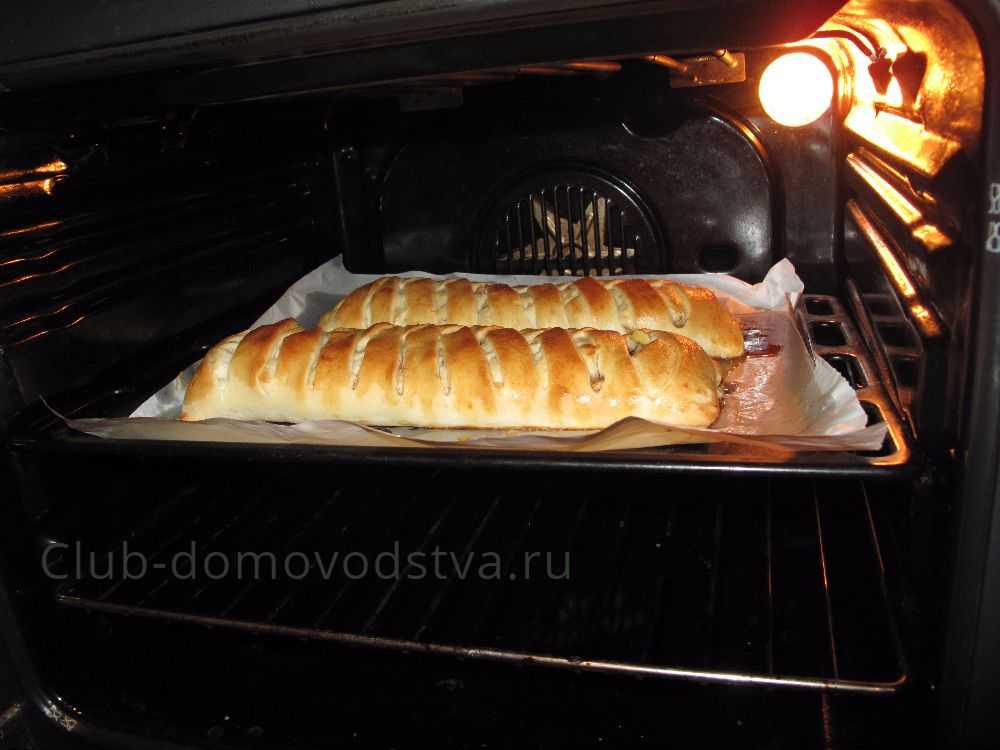 - Духовой шкаф разогреть до 180 градусов, по достижении этой отметки отправить в него заготовку пирога на 30 минут.