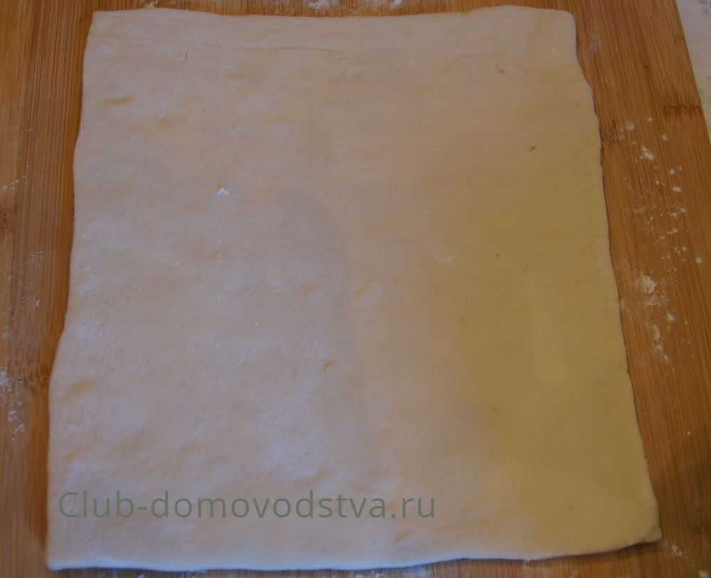 - Слоеное тесто превратить в тонкий пласт с помощью скалки, его толщина не должна быть больше 4-5 миллиметров.