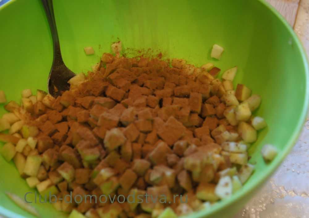 Нарезаем яблоки, сбрызгиваем лимонным соком и посыпаем корицей