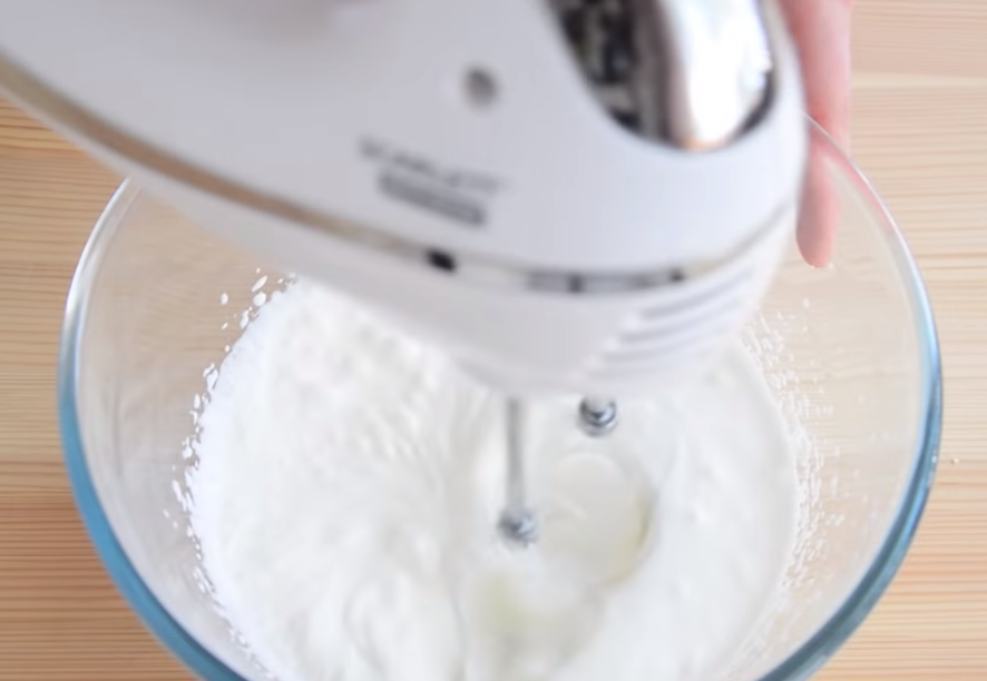 - Продолжайте взбивать смесь до тех пор, пока сахар полностью не растворится в ней. Проверить готовность густого крема можно следующим образом: наклоните миску в бок – если пена не переливается, можете выключать технику.