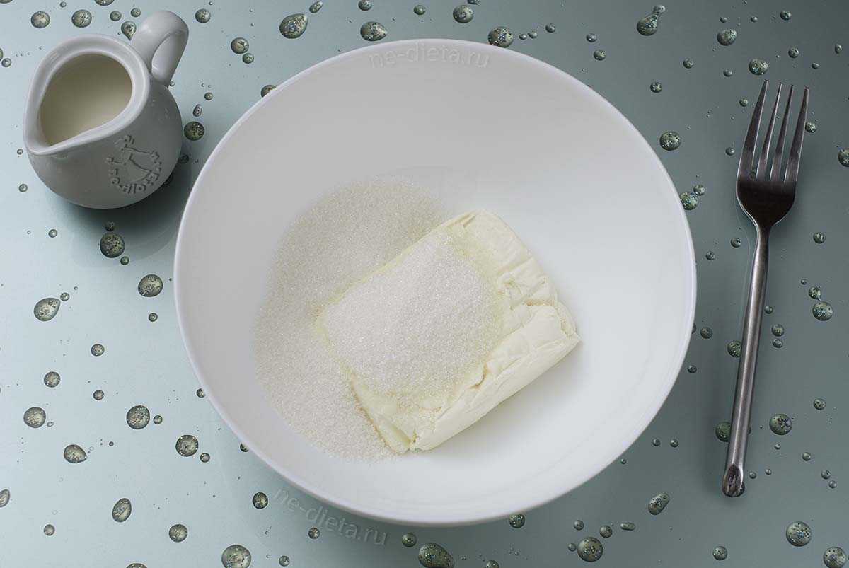 - В глубокую миску кладем 100 г сливочного масла и 250 г сахара. Взбиваем миксером до однородной массы.