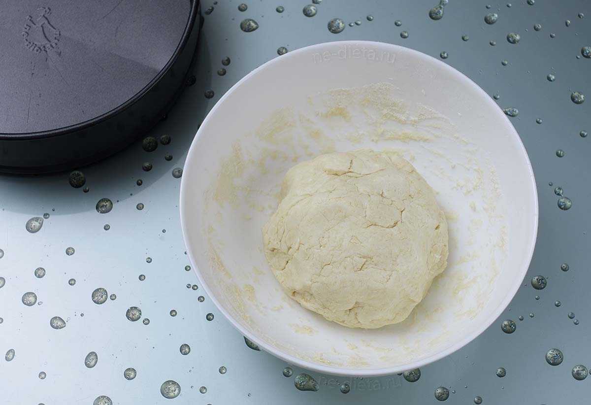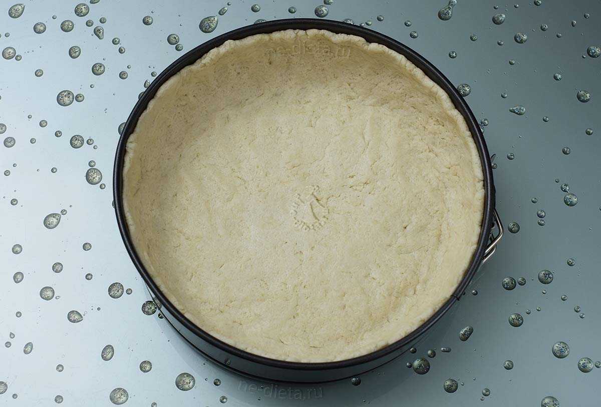 Выкладываем его в форму и распределяем по дну и бортам (тесто получается довольно мягким, поэтому фокус с раскаткой и переносом пласта в форму здесь не сработает).