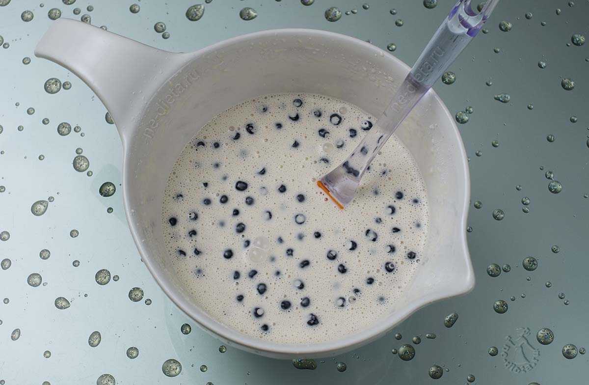 8. В сметанную заливку добавить чернику и аккуратно перемешать все ложкой. Если ягоды были заморожены, то их следует предварительно разморозить и обсушить.