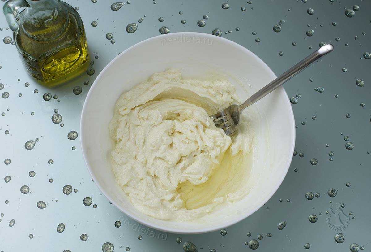 Шаг 2. В желтки выложите творог и сливочное масло. Массу нужно взбить блендером или перетереть самостоятельно вилочкой, но нужно достичь максимальной однородности. Никаких крупинок, кусочков масла. По консистенции масса будет напоминать сладкую творожную массу, продающуюся в супермаркетах. Затем, добавьте в массу йогурт и снова тщательно перемешайте. Йогурт – продукт очень легкий и низкокалорийный, поэтому мы используем именно его. Но будьте осторожны, это должен быть обыкновенный белый йогурт. Сладкие йогурты едва ли можно назвать диетическими.