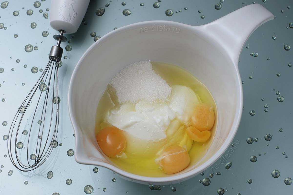 - Далее соединить компоненты для заливки – сметану с яйцами, сахаром и крахмалом, взбить миксером.