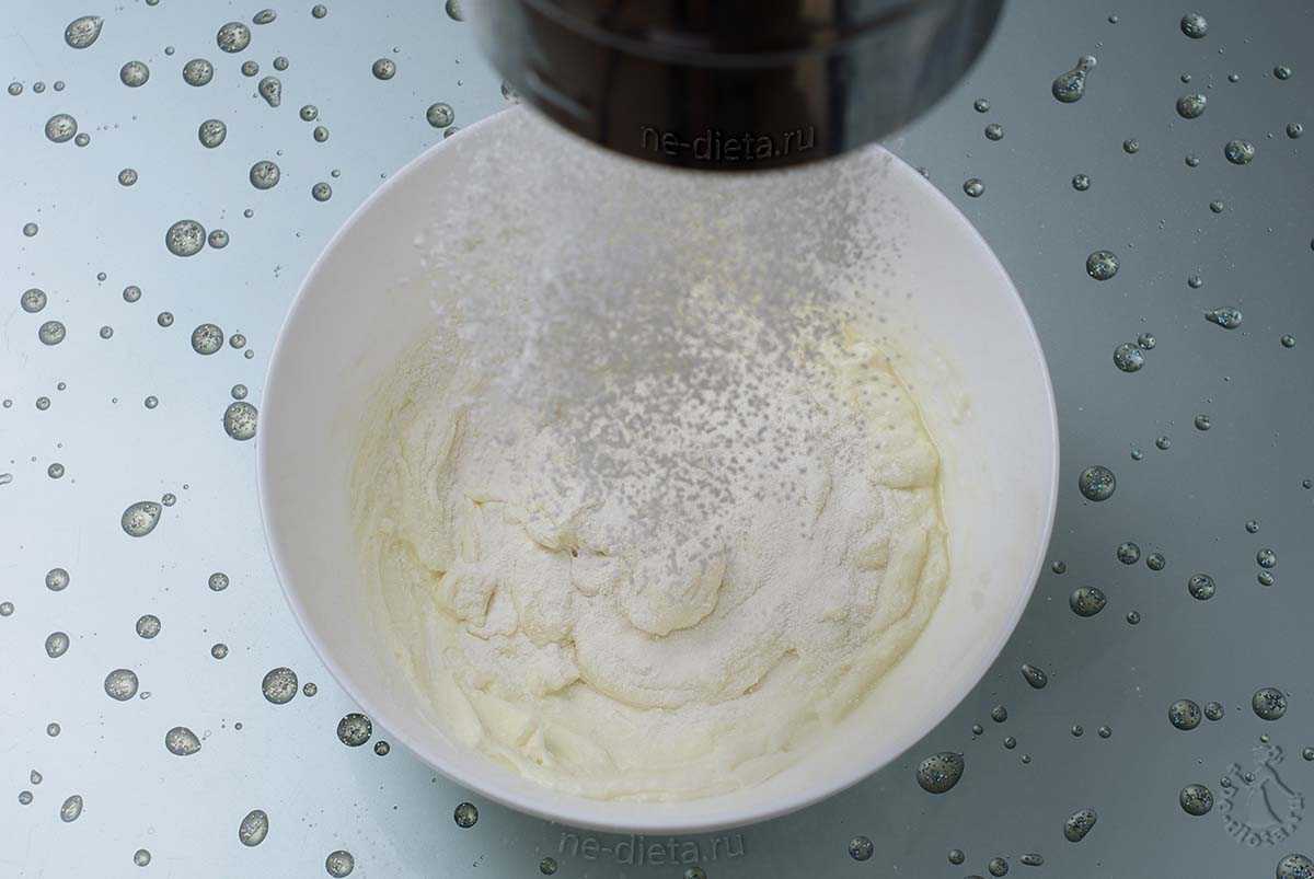 3. В тесто всыпать муку, просеянную с разрыхлителем.