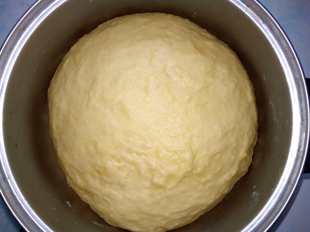 Сливочное масло поместите в небольшую емкость, лучше всего металлическую кастрюлю небольшого размера, и растопите на среднем огне кухонной плиты. Соль необходимо смешать с сухими дрожжами, затем с молоком, 2 столовыми ложками сахара, мукой и растопленным сливочным маслом. Из этих ингредиентов нужно замесить не очень густое и не очень тяжёлое тесто, постепенно присыпая мукой до того, пока оно не перестанет прилипать к рукам.