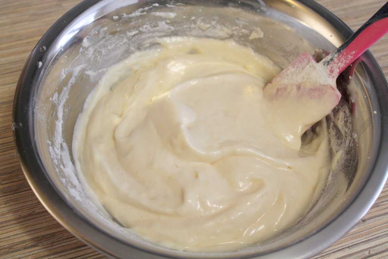 11. Затем добавляем оставшиеся белки и также осторожными круговыми движениями вмешиваем их в тесто. Готовая масса должна иметь густую, но легкую и пышную консистенцию, быть полностью однородной, без комочков и крупинок.