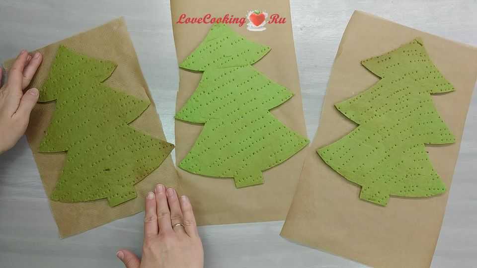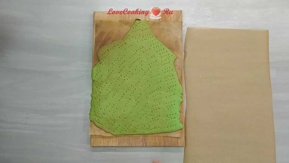Делим тесто на 3 части. Тонко раскатываем по размеру ёлки на коврике для выпекания. Накалываем вилкой.