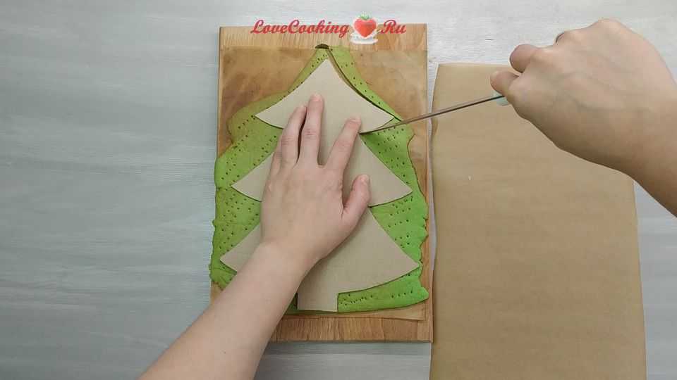 Можно и сразу обрезать тесто по трафарету, ещё до выпечки. Я это делала после, так как мне нужны были зеленые края елки, а при выпечке они коричневеют и только срез получается нужного цвета.