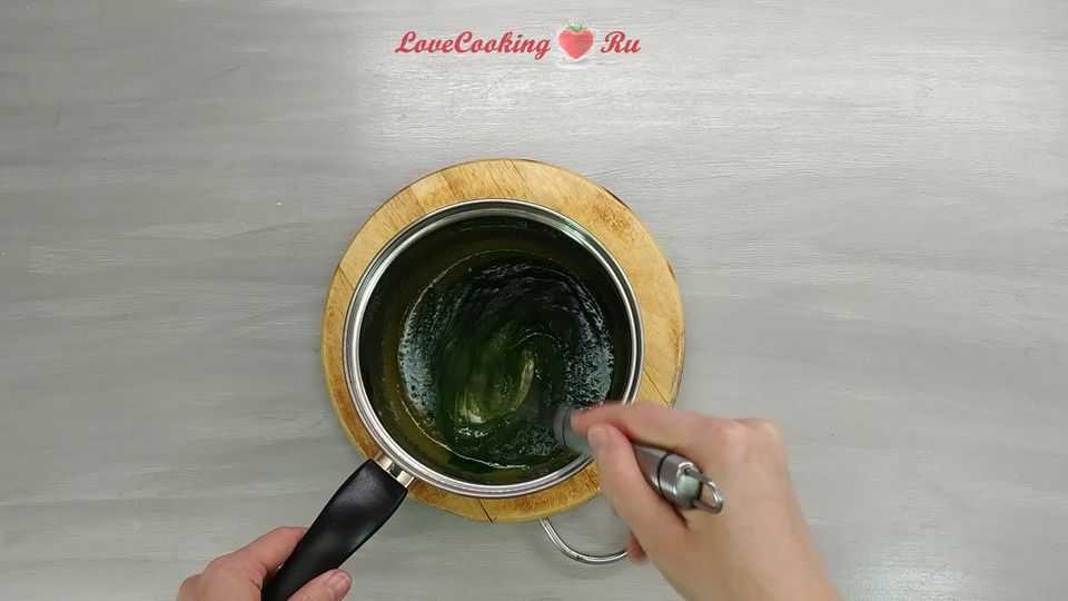 Нагреваем до объединения всех ингредиентов. Добавляем чай Матча, хорошо перемешиваем. Можете и не окрашивать тесто или использовать любые пищевые красители. Если окрашиваете, то делайте более насыщенный цвет, так как с добавлением муки и при выпечке он посветлеет.