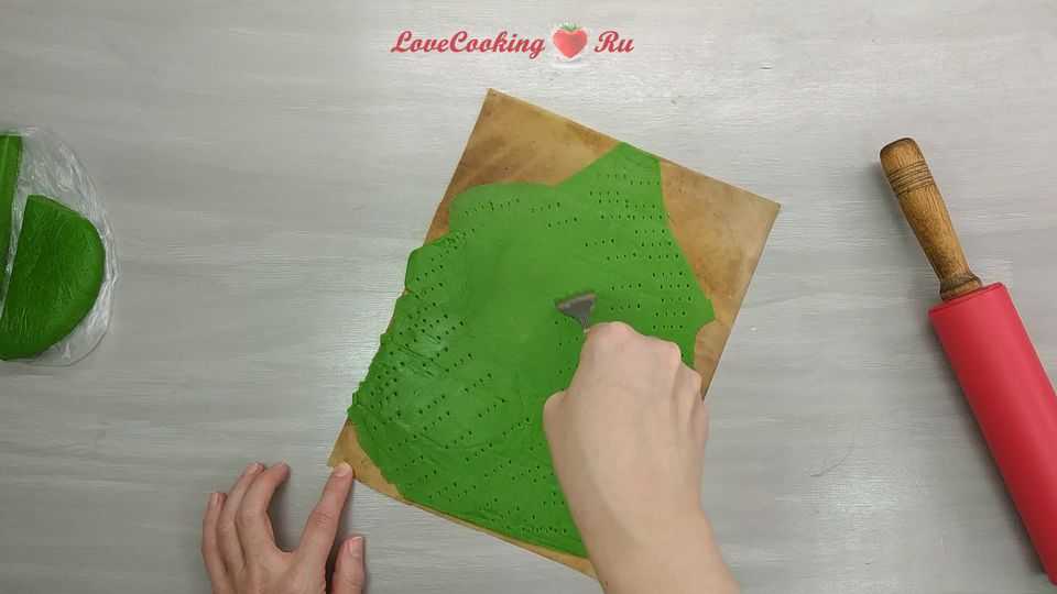 Теперь раскатайте сахарную мастику с добавлением зеленого пищевого красителя и полностью накройте торт. Разровняйте сахарную мастику, чтобы получилась ровная поверхность.