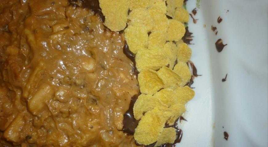 4. Отправляем миску с маршмеллоу и маслом в микроволновую печь на 1 минуту. Маршмеллоу надуется, но это нормально. Если помните, я делала из этих воздушных конфет мастику))) Затем содержимое миски хорошо перемешиваем и выливаем на хлопья. Перемешиваем ложкой. После чего оставьте эту массу на 20 минут остывать.