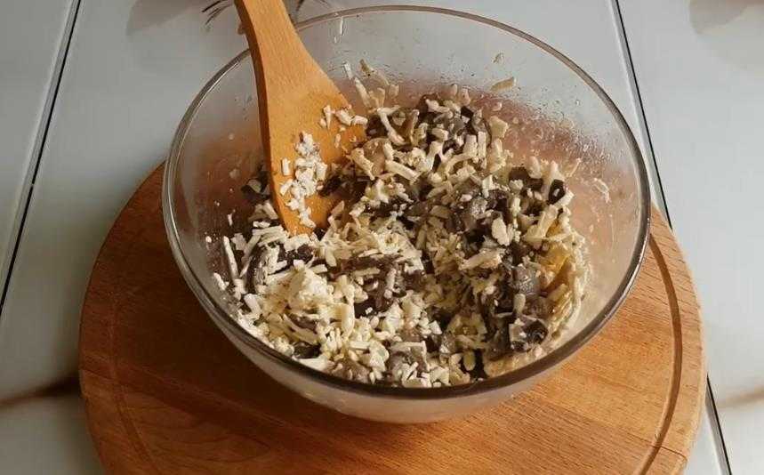 Брынзу натереть на крупной овощной шинковке. Перемешать с остывшей грибной начинкой до однородности.
