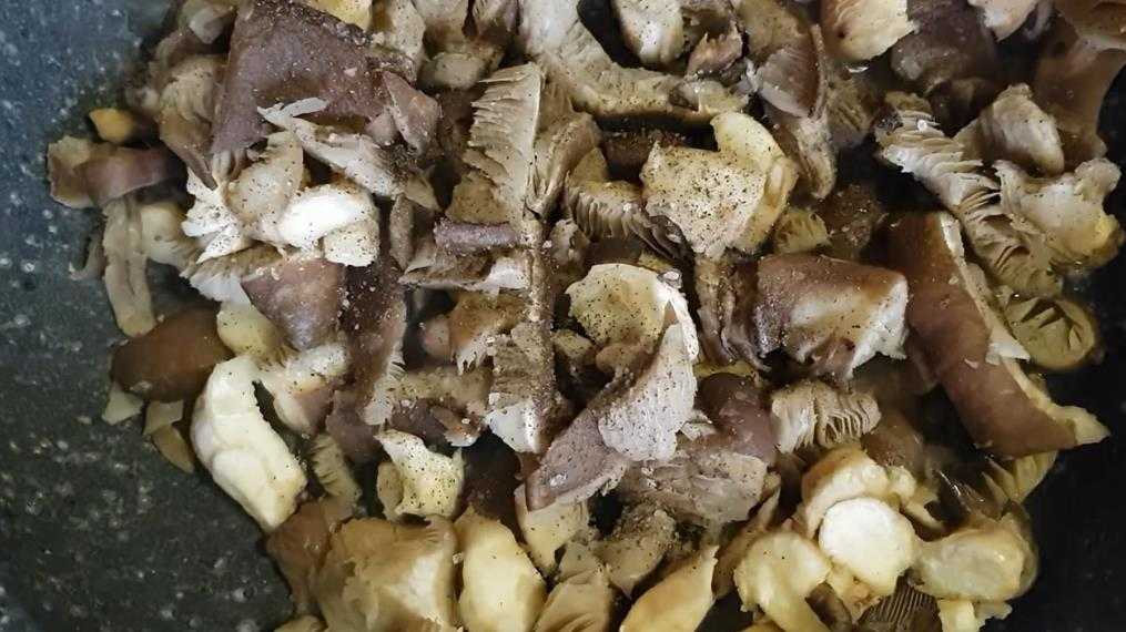 На раскаленном растительном масле обжарить 3 минуты мелко нарезанные грибы. В середине процесса посыпать солью и черным перцем.