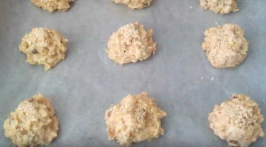 - Духовку разогреваем до 180°С, застилаем противень пекарской бумагой и выкладываем на нее тесто ложкой или руками. Формируем печенья и ставим выпекаться на 25-30 минут.