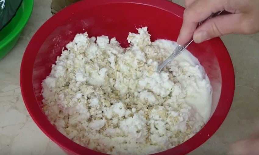 - Овсяные хлопья смешивают с мукой и добавляют к полужидкой масляной массе. Добиваясь нужной консистенции, допустимо при вымешивании долить столовую ложку воды. Если смесь жидкая, подсыпают муку.