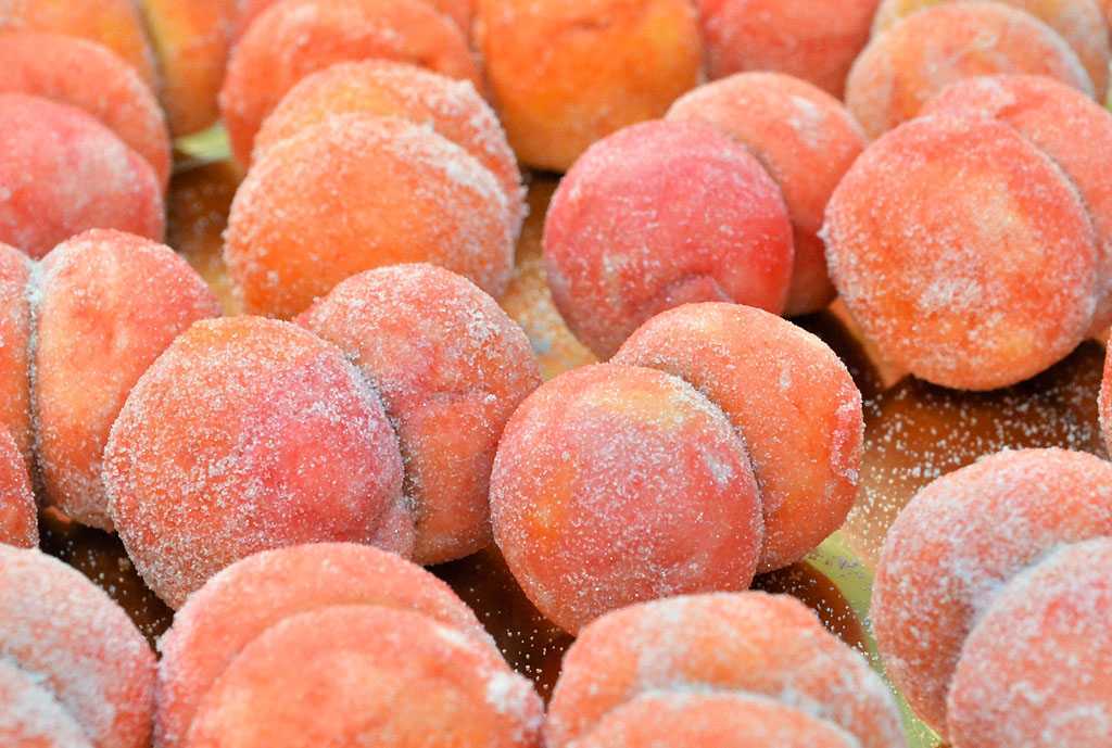 Приготовленной только что начинкой наполните сферы, каждое печенье склейте, придавая ему форму персика. Затем обмакните каждый такой персик в смородиновом соке или варенье, пока мокрое печенье, его обваляйте в сахаре.