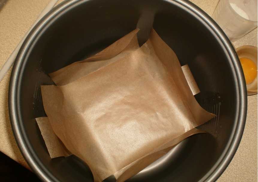 Чашу мультиварки следует выстелить бумагой для выпечки, оставляя достаточно высокие края, с помощью которых можно извлечь десерт из формы, не нарушая его целостности