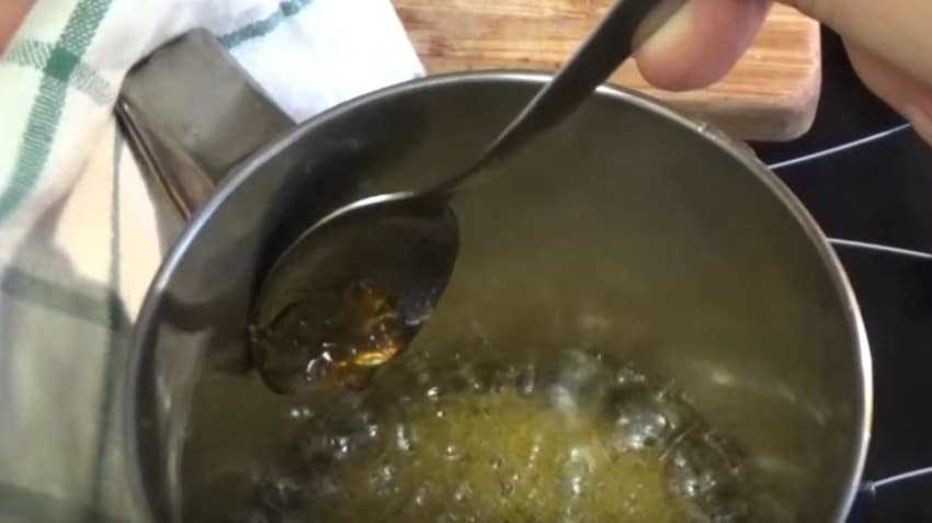 3. Сахар с водой, который мы отложили в начале, поставьте на маленький огонь и хорошо прогрейте, помешивая. Когда жидкость приобретет коричневатый оттенок, добавьте половину меда, и варите, пока он не растворится.