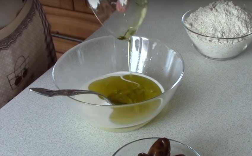 - Теперь пересыпьте орехово-овсяную муку в глубокую миску, добавьте стакан кипятка и быстро перемешайте. Также постепенно введите оливковое рафинированное масло и немного сахара по вкусу. Сахар в данном случае можно заменить жидким свежим медом.