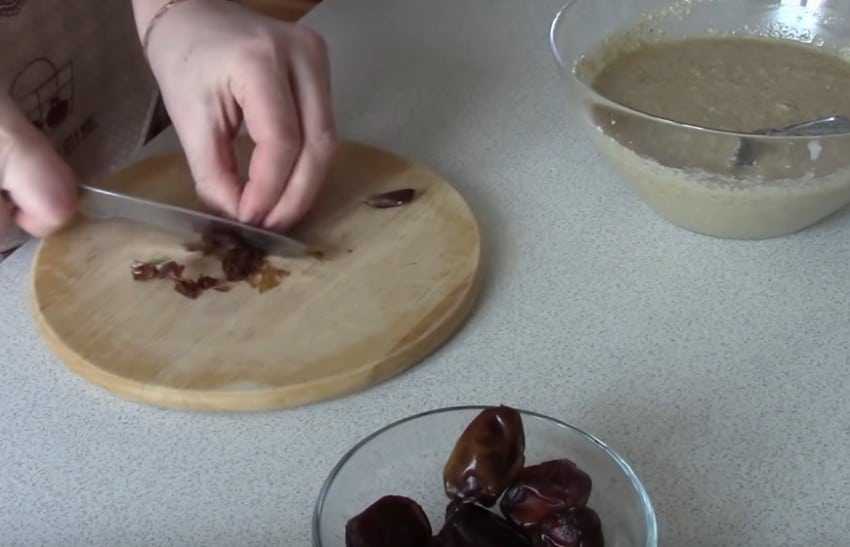 - Финики помойте и проварите 5 минут в 150 мл воды. Остудите и нарежьте мелкими кусочками.