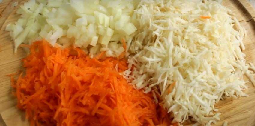 1. Все овощи почистите и промойте. Лук измельчите, морковь и корень сельдерея натрите на терке, капусту тонко нашинкуйте, картофель нарежьте кубиками.