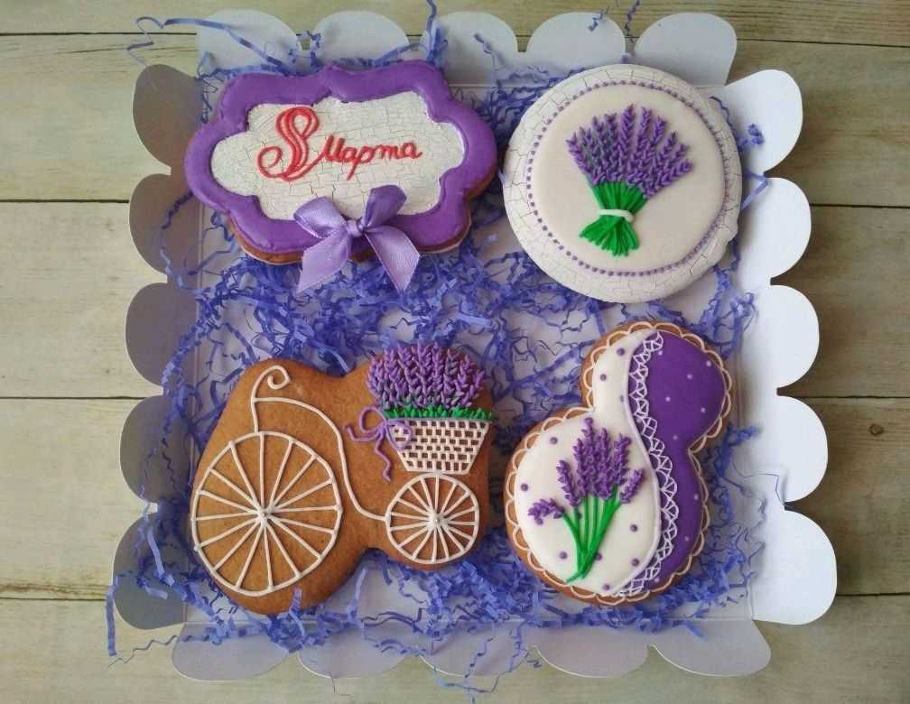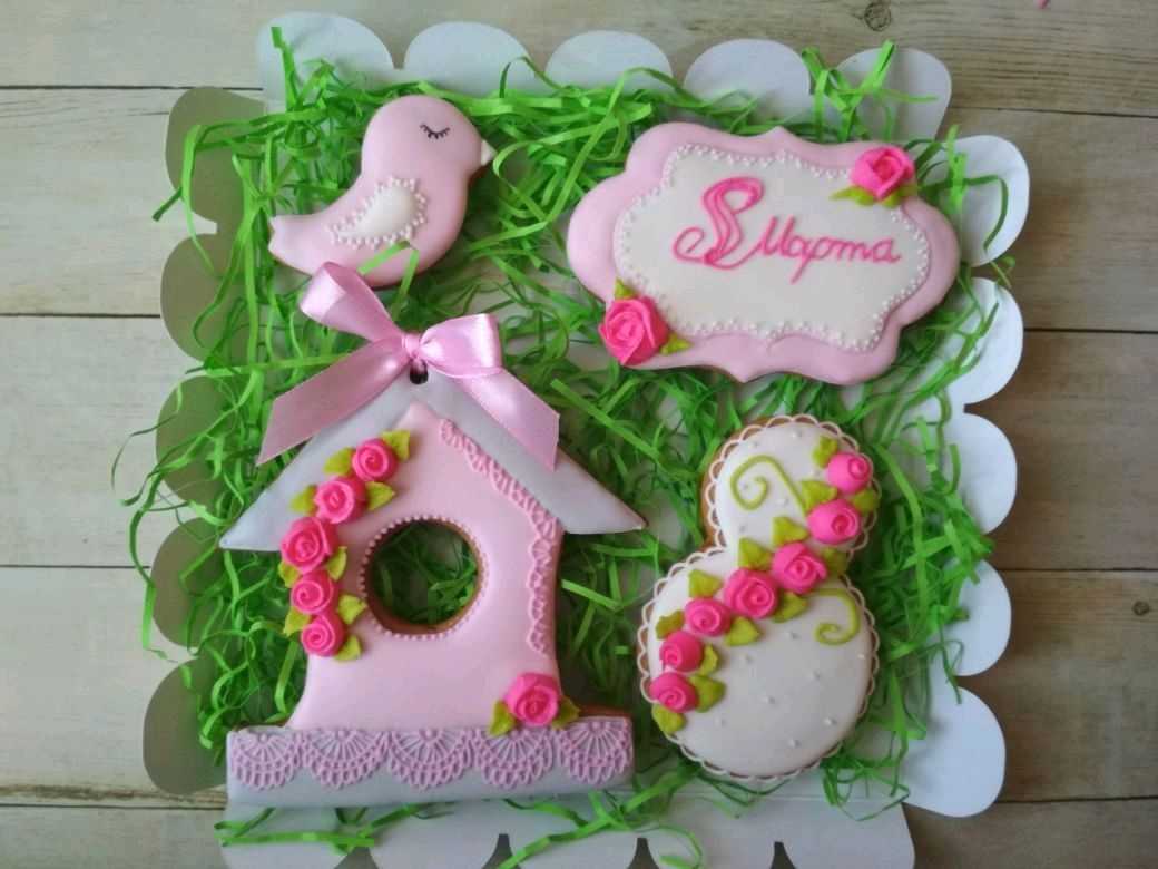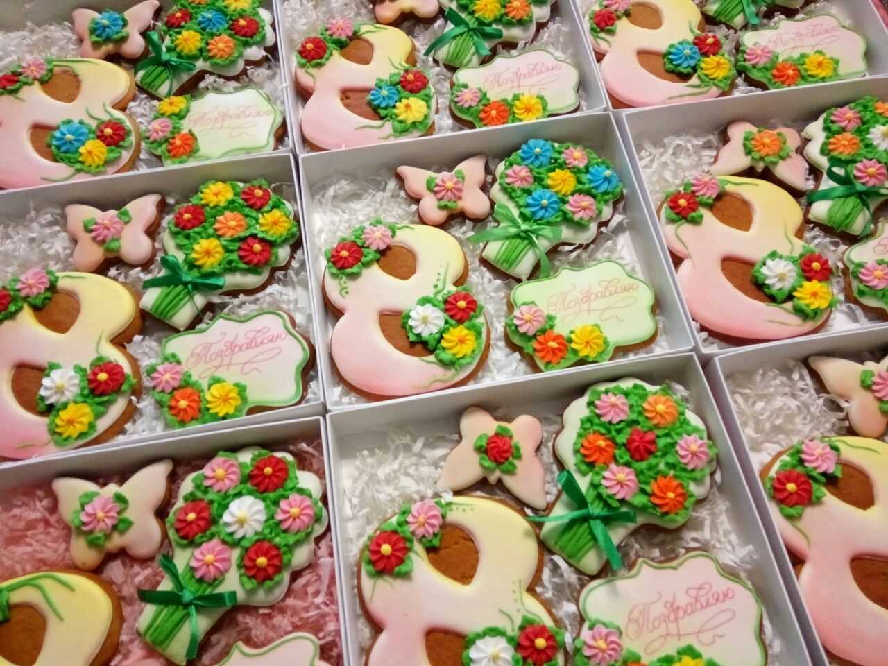 Идей для оформления «мартовских» пряников более чем достаточно, но если хочется старой доброй классики, то лучшим вариантом, конечно, станет изделие в форме восьмерки. Декорировать заветную цифру можно будет не только с помощью белоснежной глазури и всевозможных цветочков из мастики, марципана и все того же взбитого белка, но и тонкими шелковыми лентами, предусмотрительно проделав для этого дырочки.