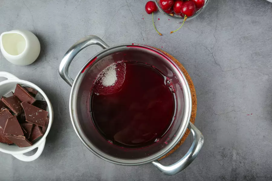 Шаг 7 Вишнёвый сок влейте в сотейник, всыпьте 50 г сахара и доведите до кипения на среднем огне. Затем снимите сироп с плиты и дайте остыть до комнатной температуры.