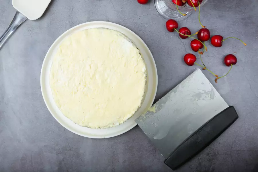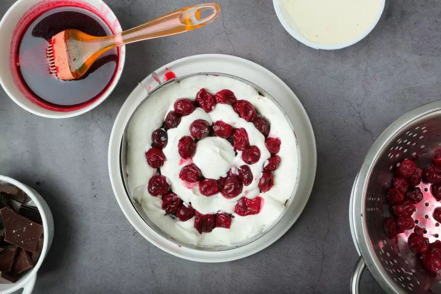 Шаг 12 Затем выложите второй корж и пропитайте его вишнёвым соком. Выложите слой крема, сделайте небольшое углубление в центре и выложите туда 2 ст. л. вишни. Повторите действия с оставшимися коржами, кремом и вишней. Оставьте немного крема для украшения. С торта снимите кольцо. Оставшимся кремом обмажьте весь торт и уберите на ночь в холодильник.