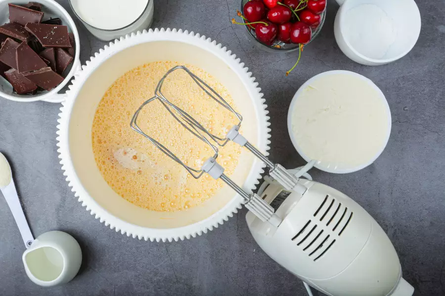 Приготовление торта начинается с выпечки бисквита. Для этого сначала нужно просеять через мелкое сито муку и какао в отдельную ёмкость. Добавить к ним соду и всё хорошенько размешать. Затем надо отделить желтки от белков. Желтки и белки поместить в посуду, удобную для взбивания. Желательно, чтобы это была стеклянная или металлическая (но не алюминиевая) посуда. Она должна быть обезжиренной и сухой. При отделении белков надо следить, чтобы в них не попало ни капли желтков. Добавить к желткам 2 стол. ложки сахара и взбить их венчиком или миксером. Примерно через минуту налить в ёмкость кефир и продолжить взбивать, пока масса не станет более пышной и светлой.