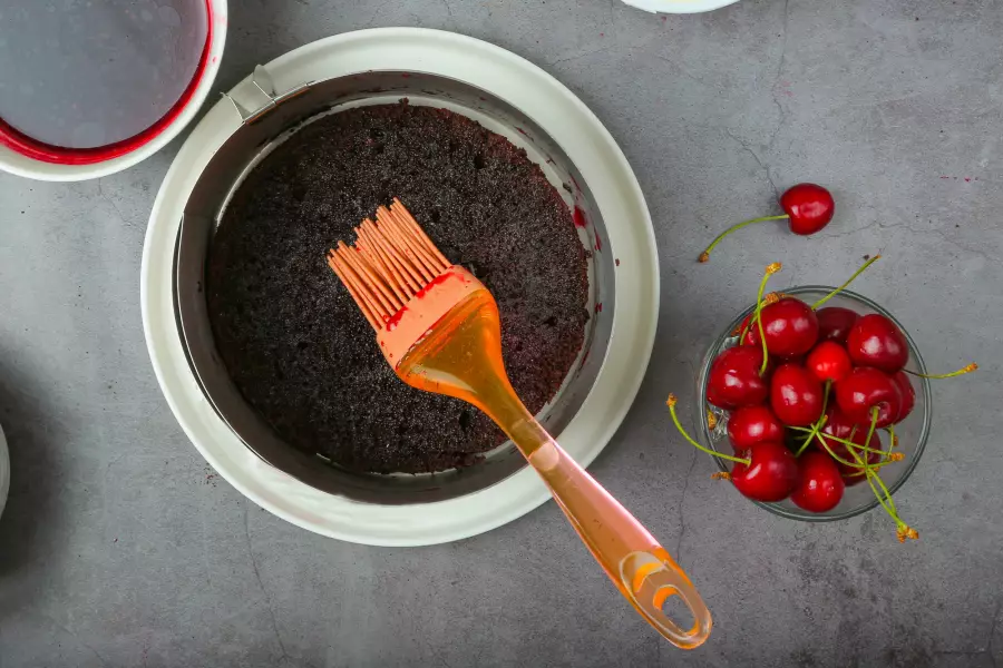 13. Сборка начинается. Снимаем с тарелки вишни, покрытые коньяком. Жидкость из вишни станет пропиткой для коржей. Разрезать бисквит на 3 части. Выложите первый пирог на тарелку. Пропитайте его силиконовой кисточкой.