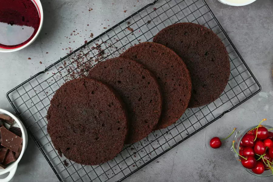 Шаг 5 Готовые бисквиты достаньте из духовки и оставьте на 5 минут. Затем аккуратно достаньте их из форм, переложите на решётку и дайте полностью остыть. В это время разморозьте вишню (мы использовали замороженную вишню без косточек) при комнатной температуре. У остывших коржей срежьте верхушки и разрежьте каждый бисквит на 2 коржа толщиной примерно 1,5 см.