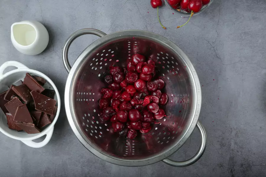 - Если вишня свежая, то нужно удалить косточки. Если замороженная, то ее надо предварительно разморозить и слить сок (его можно будет использовать для пропитки).